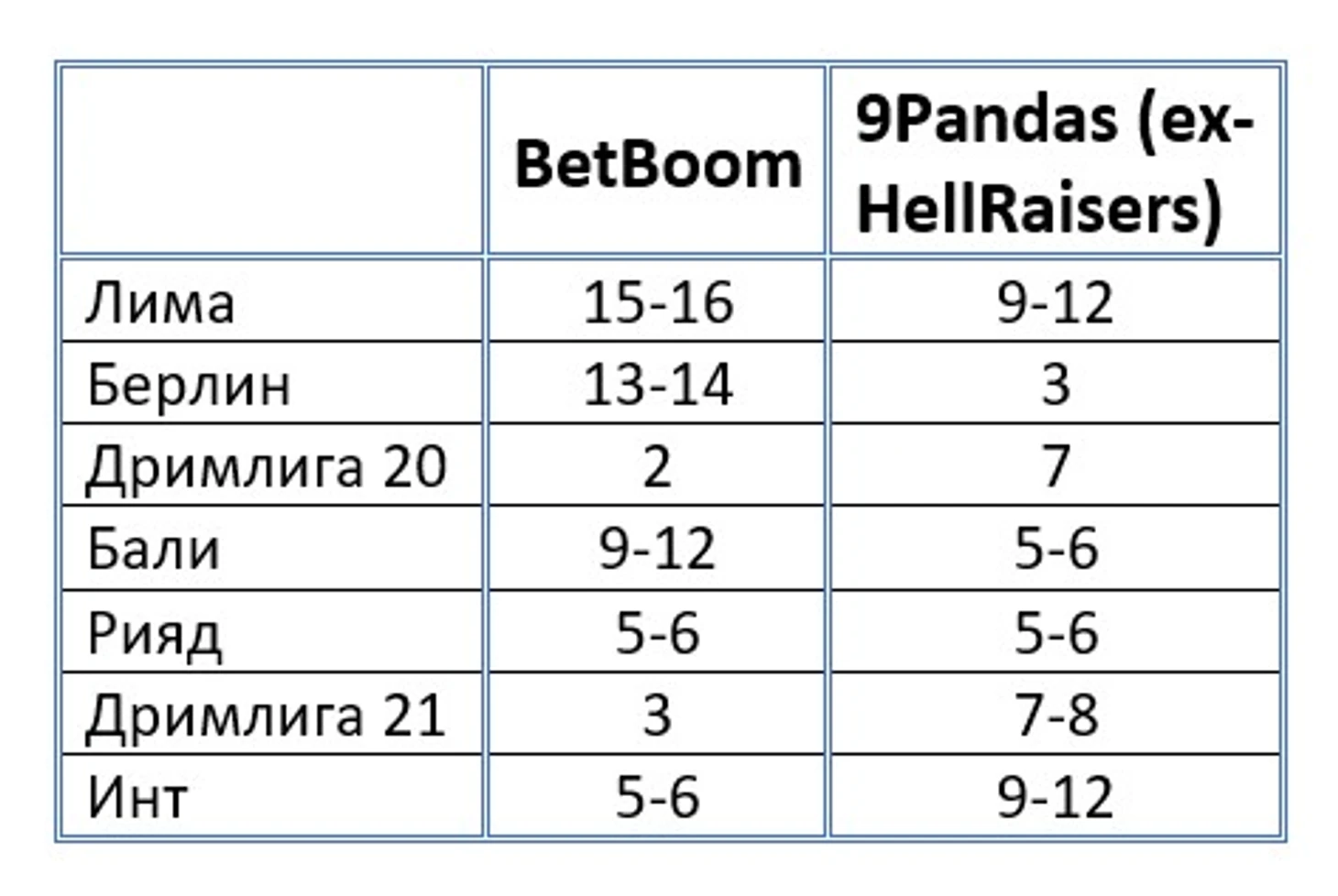 BetBoom Team, на мой взляд, однозначно является топ-2 командой в регионе. Тут, конечно, болельщики Панд могут возмутиться, ведь у 9Pandas третье место на мажоре в Берлине. Давайте посмотрим на результаты обеих команд в этом сезоне на основных турнирах.