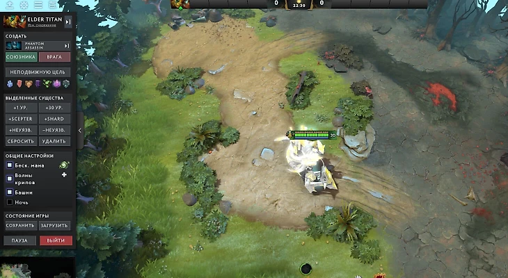 Если нажать «Опробовать» в разделе героев, откроется миниатюрная карта Доты, удобная для тестов способностей или механик. Можно пустить волны крипов, поставить ночь или день, добавить вражеских и союзных героев, даже руны наспавнить! Однако кое-чего все же не хватает: