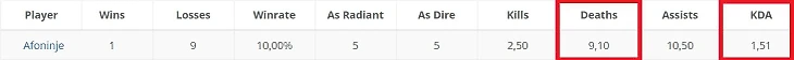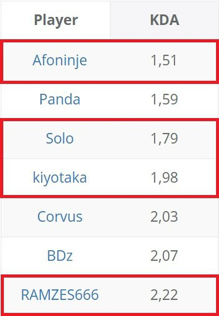 Afoninje точно не тянет высокий соревновательный уровень. Андрей стал лидером по смертям на турнире: 91 смерть за 10 матчей. Соответственно, у него же худший KDA – всего 1,51!