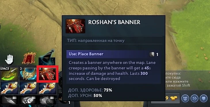 4. В игру добавлен новый предмет Рошана: Roshan’s Banner. Устанавливает знамя в любой точке карты на 5 минут. Крип с линии (мечник, маг или катапульта), прошедший в радиусе 750 от знамени, на 45 секунд получит +75% к здоровью и +50% к урону. Знамя можно уничтожить шестью атаками героя (атаки крипов считаются за 1/4 атаки героя). Предмет расходуется при использовании. Вражеская команда получает оповещение о размещении знамени. Эффекты нескольких знамен не складываются. Награда за уничтожение знамени: 200 золота.