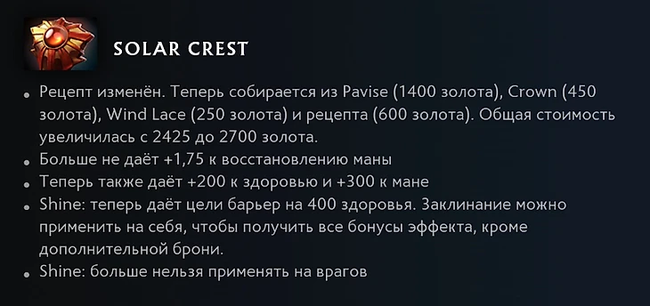 В свежем патче в Доту добавили парочку новых и переделали кучу старых предметов. Да так переделали, что новые сборки придется разучивать пару недель. Но уже сейчас определился самый сломанный из обновленных предметов – Solar Crest. Из обоюдоострого баффа/дебаффа он стал просто мощнейшим в игре баффом, который дает сразу кучу всего.