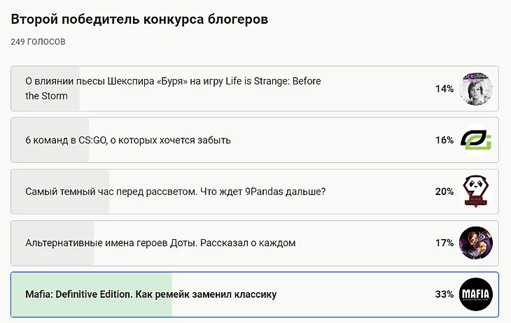 Текст про «Мафию» победил в голосовании – за него отдали голос 33 процента пользователей. Поздравляем с заслуженной победой! Материал автоматически проходит в финальное голосование и уже точно поборется за Steam Deck! А еще автор получает 1500 рублей на кошелек Steam – мы напишем тебе на почту в течение трех дней.