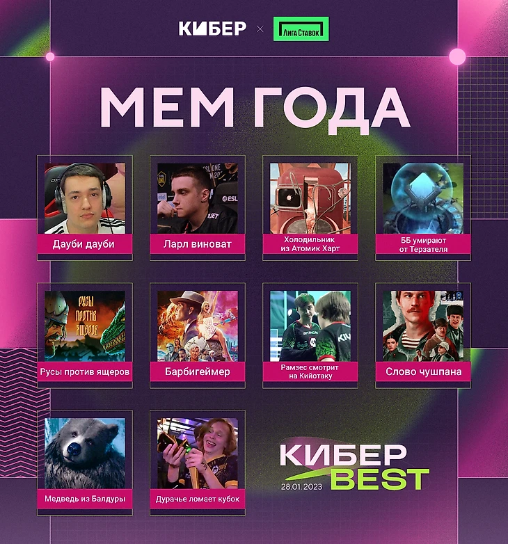 28 января пройдет наша ежегодная церемония награждения премии Кибер Best! На ней мы объявим лучших киберспортсменов и блогеров, а также назовем лучшие игры, сериалы и фильмы 2023 года. Генеральный партнер премии – Лига Ставок.