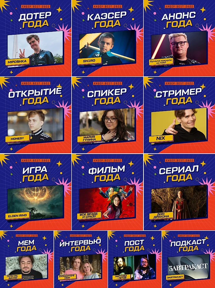 В Кибер Best мы выбираем лучших киберспортсменов и блогеров, а также лучшие игры, сериалы и фильмы. В этом году 23 номинации.