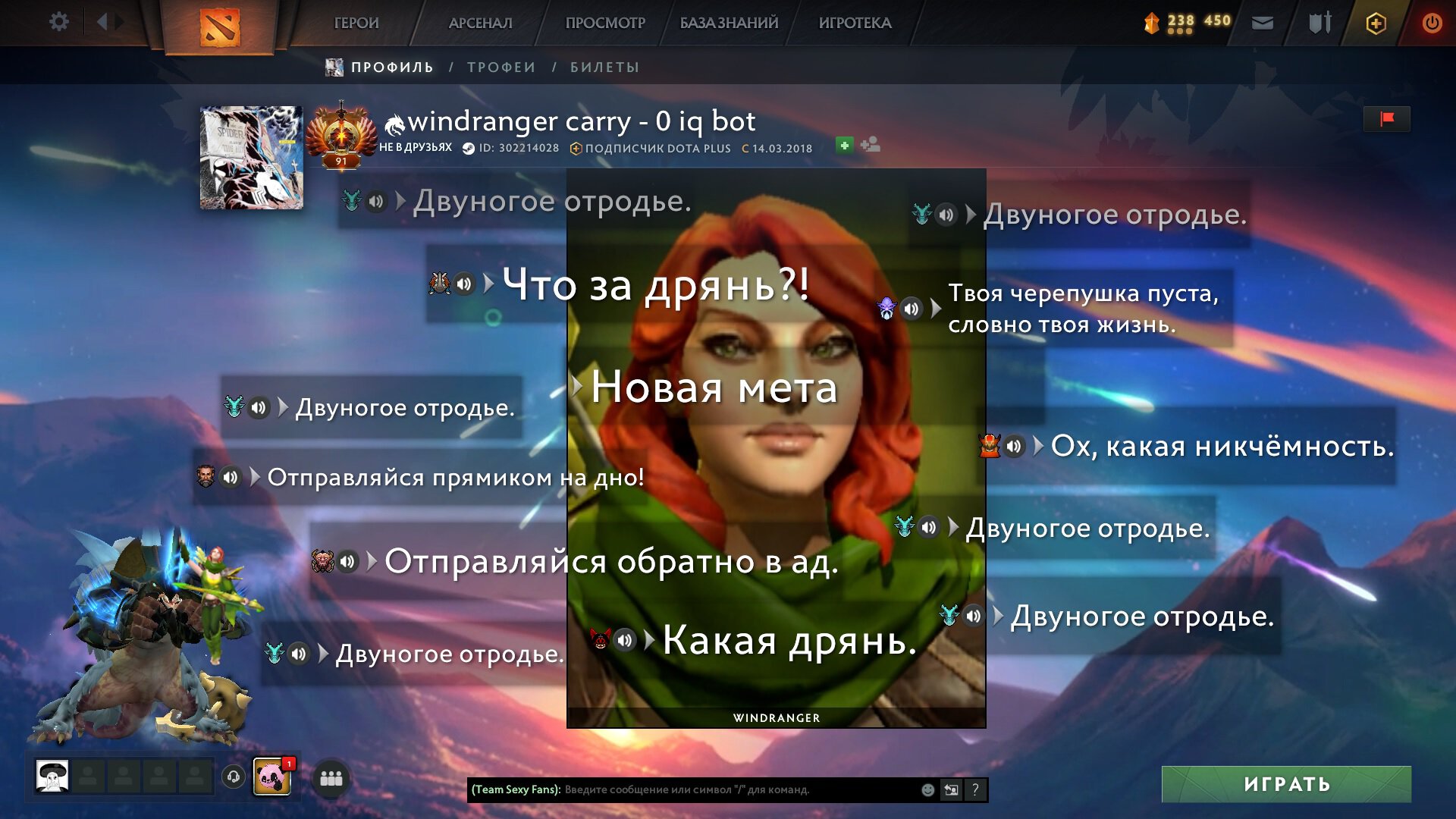 Магомед проявил креативность и выразил своим профилем негодование по поводу текущей меты. И главный объект его ненависти – керри-ВР’ка. Об этом свидетельствует как его ник («windranger carry – 0 iq bot»), так и всякие издевательские фразы персонажей из Доты.