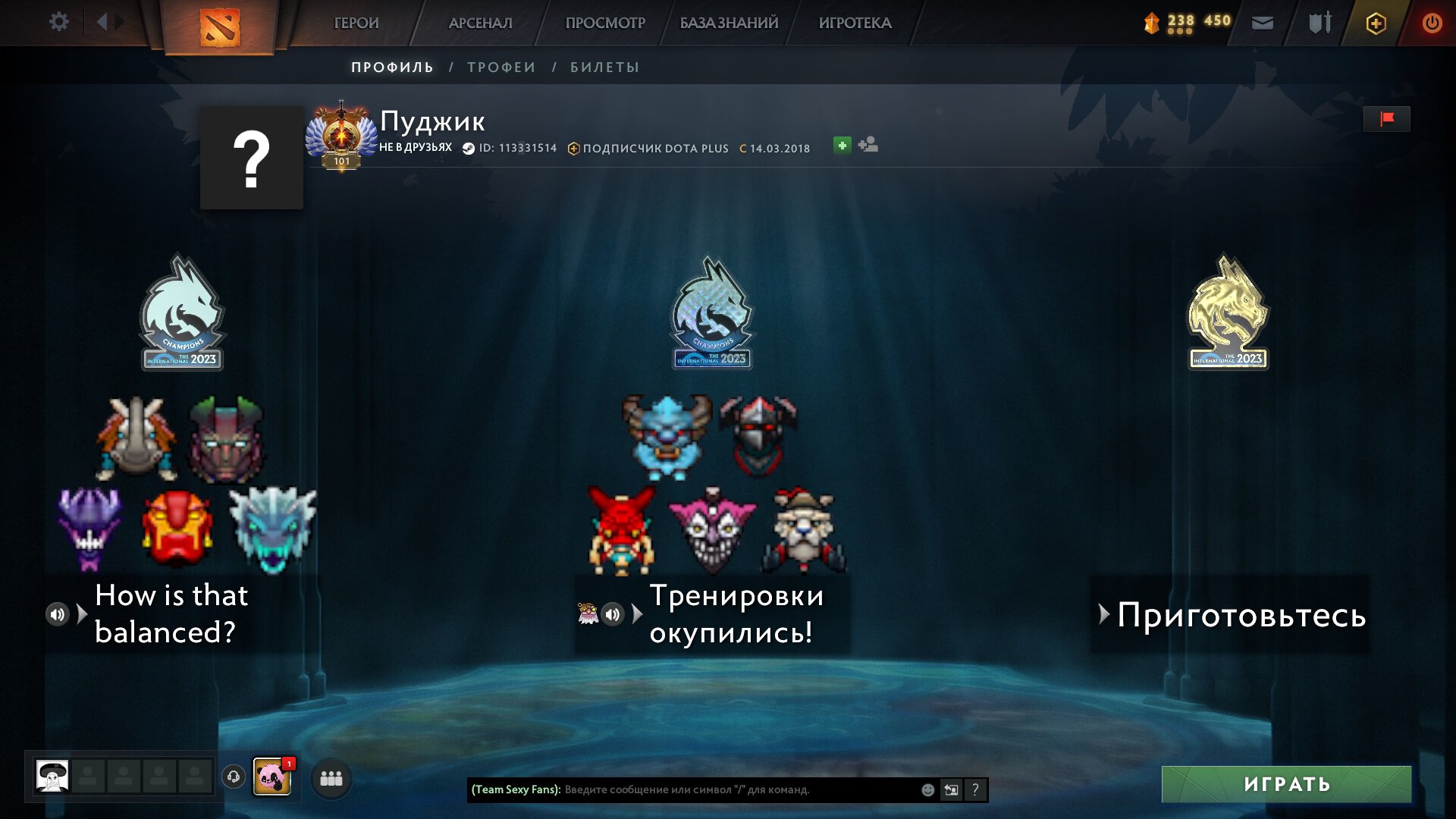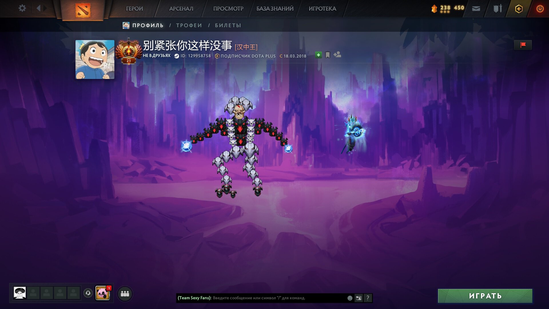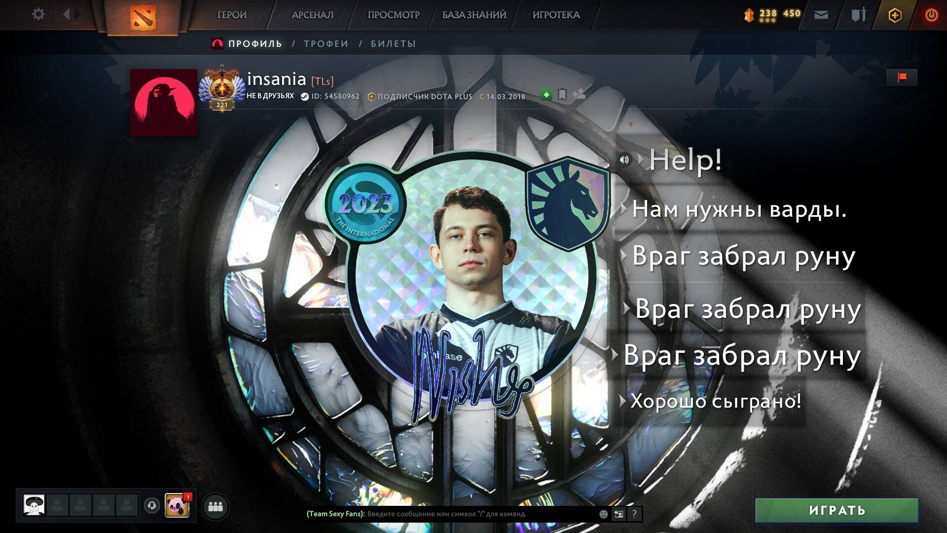 Звание самого смешного профиля среди профессионалов по моему мнению достается Инсэйнии. На его витрине изображен мидер Liquid Ниша, который кричит фразами из колеса чата: «Помогите!», «Нам нужны варды», «Враг забрал руну», и «Хорошо сыграно!»