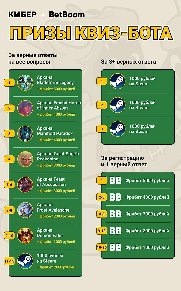 К BetBoom Dacha снова запускаем Квиз-бот! Каждый день отвечай на вопросы про Доту и турнир в Дубае и участвуй в розыгрыше классных призов, которые мы подготовили вместе с нашими друзьями из BetBoom.