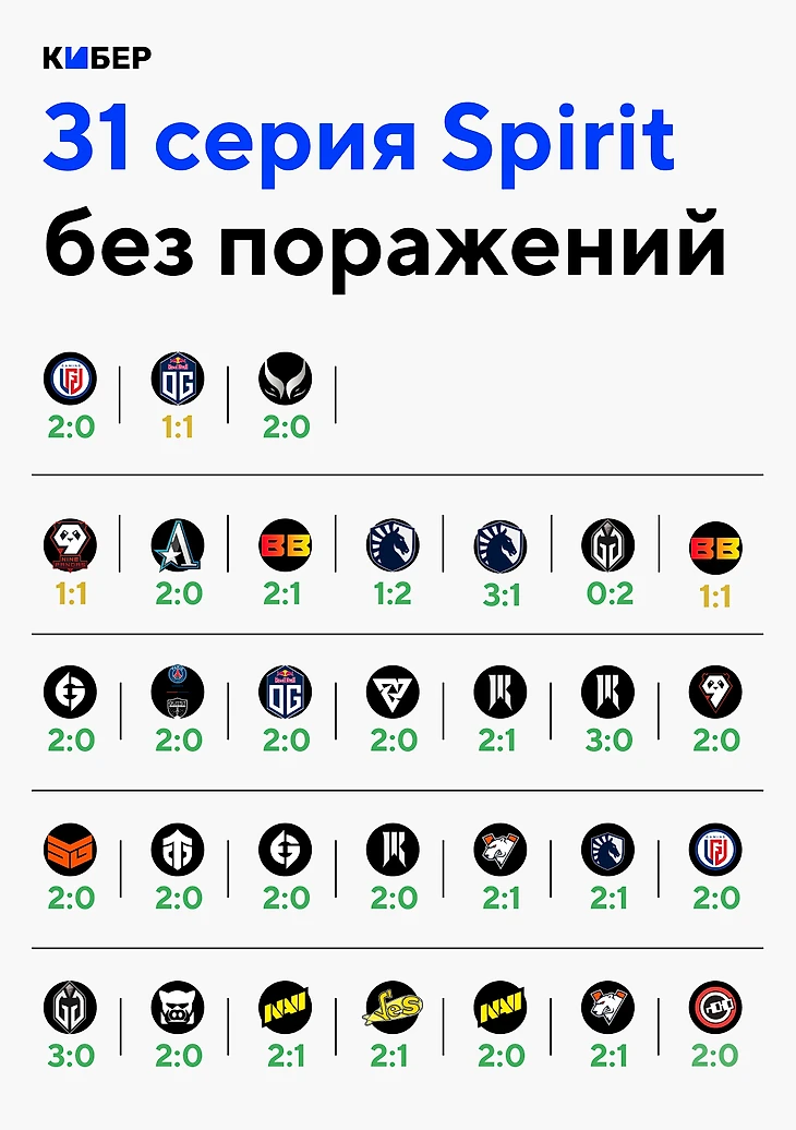 Серия без поражений отличается тем, что к ней добавляются ничьи на групповых этапах. Spirit не проигрывает уже 31 матч подряд!