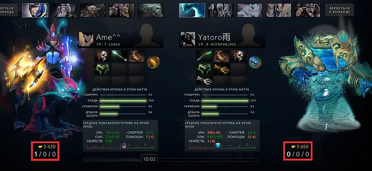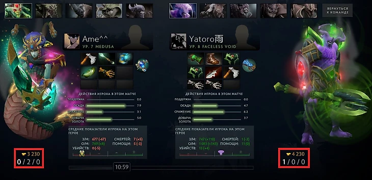Аме на Медузе отдал фб еще до крипов и пришел на линию к неуязвимому ДК уже отстающим. Войд же получил фраг и укреплялся со старта именно для того, чтобы комфортно постоять линию. Из этого и вышло преимущество Ильи в целую тысячу золота к 11-й минуте.