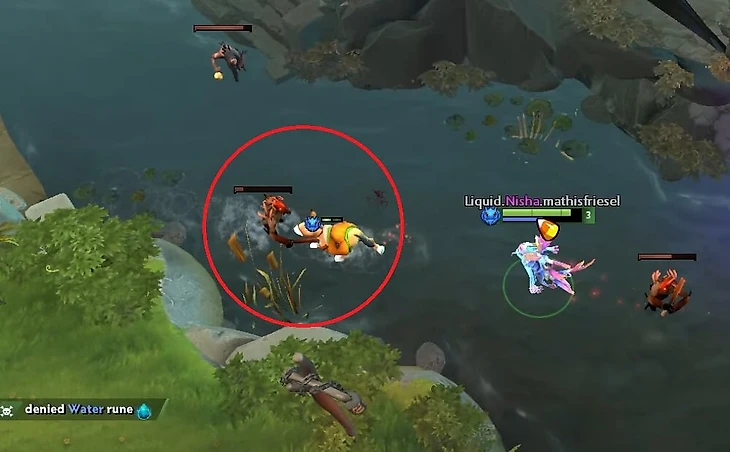 Интересный эпизод: когда Ниша выходил под первую руну Воды, то переагрил крипов и вывел их из радиуса вышки курьером. Получилось так, что он даже не потерял крипов. Совпадение? Даже если так, то выглядело это забавно, ведь курьер с патча 7.35 умирает только с 6 атак крипов.
