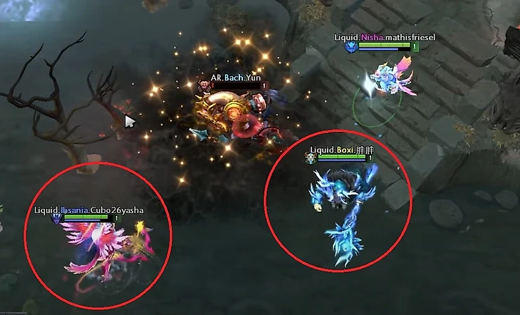 Такое бесконечное давление высасывает из Пака все ресурсы. Что заставляет Малрина либо играть пассивнее, либо идти на базу, либо даже ошибиться и умереть. В данном случае Boxi выходит на вторую руну Воды, Liquid контролят обе, и Паку приходится идти на базу уже на 4-й минуте. Ниша же остается фрифармить.