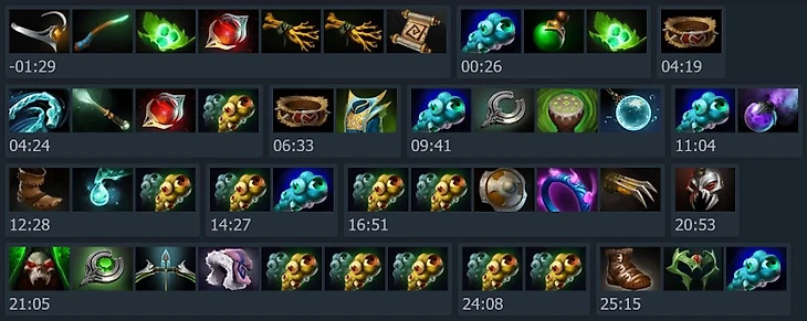 Сборки настолько же просты, как и сам геймплей: ТБ-саппорт покупает полезные семи-кор айтемы и ауры, желательно, с прицелом в лейт. Как на условном Гирокоптере-саппорте: Барабаны, Владимир, возможно, имбовые сейчас Гривсы. Плюс что-то ситуативное, по надобности, например, Вессель, Глиммер или Форс. К 25-й минуте заполняя пустые слоты инвентаря 2-3 копиями Wraith Band.