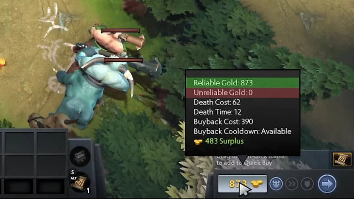 Золото в углу экрана суммируется, но между надежным и ненадежным золотом в Доте есть разница, и она играет важную роль, когда вы тратите его. При смерти вы теряете только ненадежное золото. При покупке предметов сперва используется только ненадежное золото, а затем – надежное. Вот почему игроки закупаются перед смертью: если успеть потратить все ненадежное золото, то, умерев, вы ничего не потеряете.