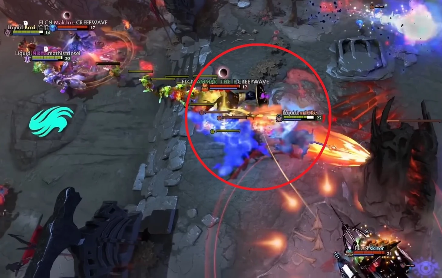 Эйс прожимает Аватар, но Аммар – тут как тут. ATF с заряженным башем все это время прятался в кустах неподалеку и ждал, пока оффлейнер Gladiators попытается сбежать в БКБ. И сразу же сбил ему телепортацию.