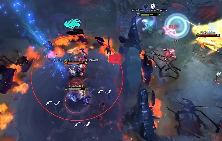 Аммар понимает, что ему нужно лишь законтролить Луну. Драка начинается с красивой комбинации: Disruption + Sacred Arrow + Spear of Mars подальше от команды. Обратите внимание, как Малрин параллельно атаке на Луну атакует бэклайн Liquid, зоня вражеских мидера и саппорта.