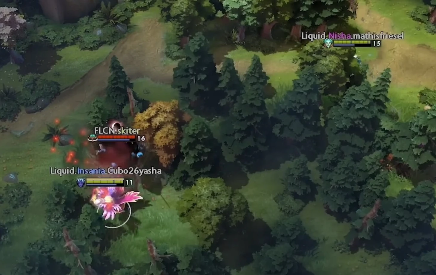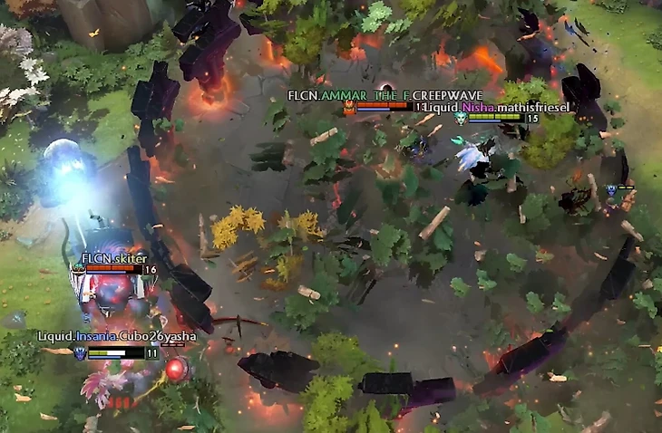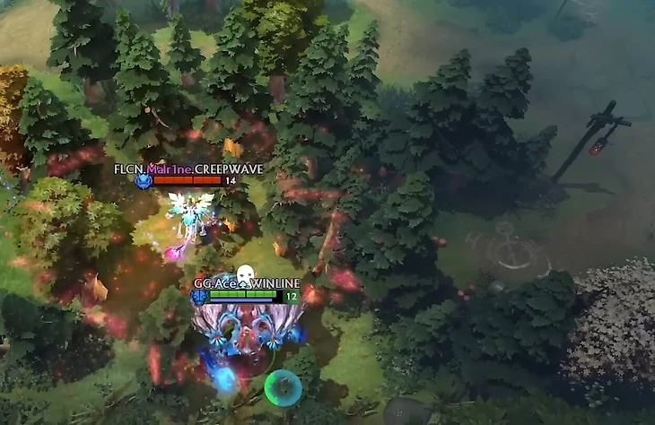 Дальше ATF телепортируется так, чтобы его не было видно из-за деревьев, и зовет на помощь керри – только вдвоем им хватит урона на Луну.