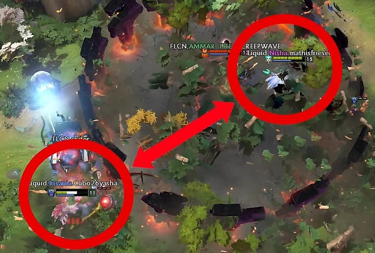 Саппорты «жидких» обычно находятся позади своих коров – тогда они могут их похилить или свапнуть. И Аммар знает, как это предотвратить. Он видит ДП, а неподалеку от нее – Венгу.