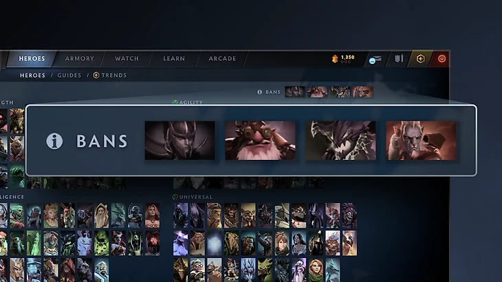 Valve убрала стадию банов в начале игры и заменила ее предпочтительными запретами, привязанными к вашему аккаунту. Теперь, открыв вкладку «Герои», вы сможете выбрать до четырех персонажей, которых хотите забанить, и в начале игры обязательно будет запрещен хотя бы один из них.
