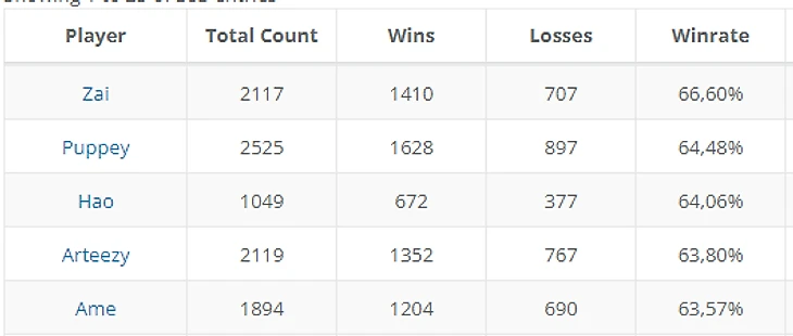 • Стабильность? Тут выбор упадет на Zai – человека с бесконечным пулом и самым высоким винрейтом на про-сцене среди всех игроков с 500+ картами (а это почти 400 дотеров!)