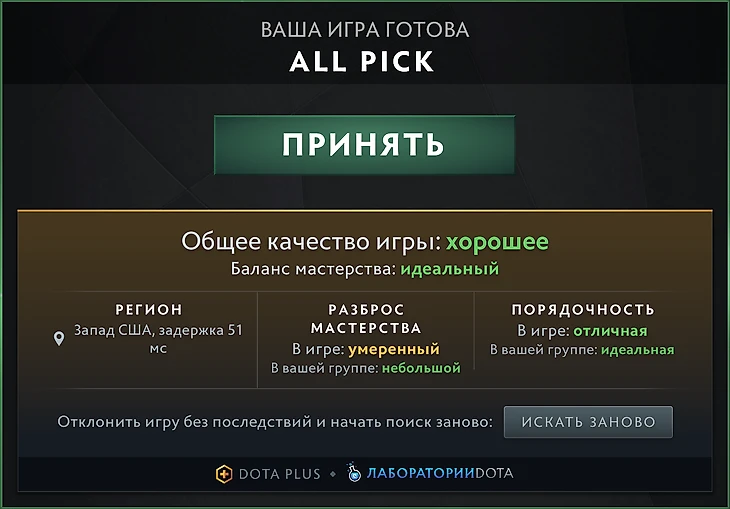 Начнем с недавнего: помните обновление с анализом подобранной игры от Dota Plus в Dota Labs? Там Dota+ показывает информацию о только что найденной игре: примерный разброс мастерства и порядочность игроков. И можно как принять эту игру, так и начать поиск заново, чтобы дождаться более подходящих условий.
