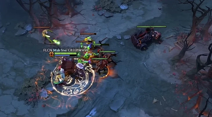 • затем максимально замедляет свою, блокируя ее. Ведь чем дольше пачки будут встречаться, тем больше времени будет у Малрина, чтобы профармить лес без потери золота на линии.