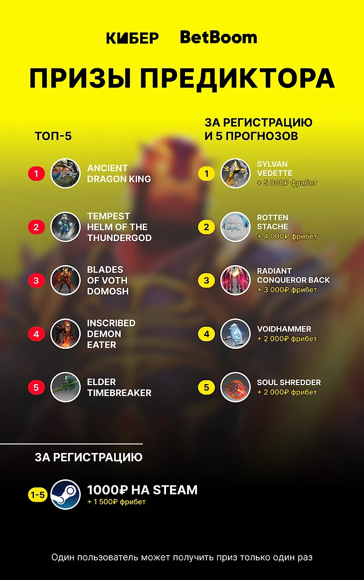 Среди тех, кто зарегистрирован в BetBoom, мы рандомно разыграем пять призов в виде пополнения кошелька Steam на 1000 рублей и фрибета номиналом 1500 рублей.