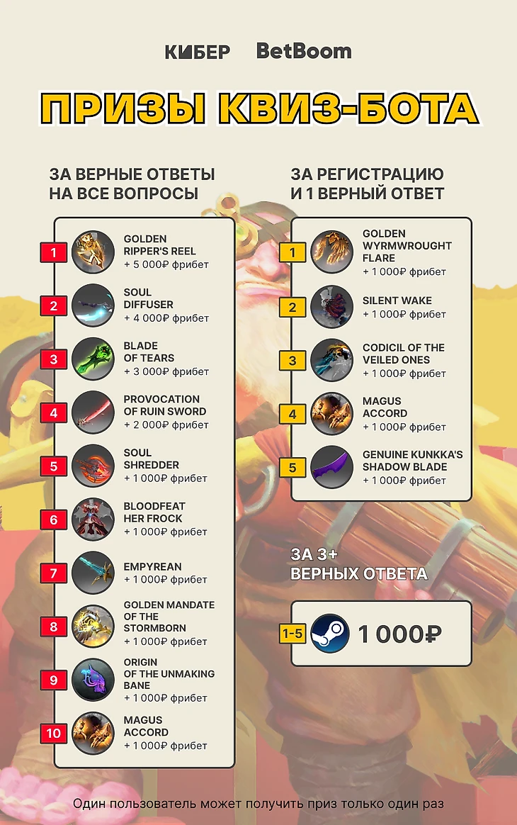 К ESL One Birmingham 2024 снова запускаем Квиз-бот! Каждый день отвечай на вопросы про Доту и турнир в Бирмингеме и участвуй в розыгрыше крутых призов, которые мы подготовили вместе с нашими друзьями из BetBoom.