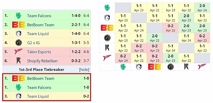 В группе А в переигровках за выход в верхнюю сетку сошлись BetBoom Team, Falcons и Liquid. В результате Liquid начнут плей-офф в нижней части сетки.