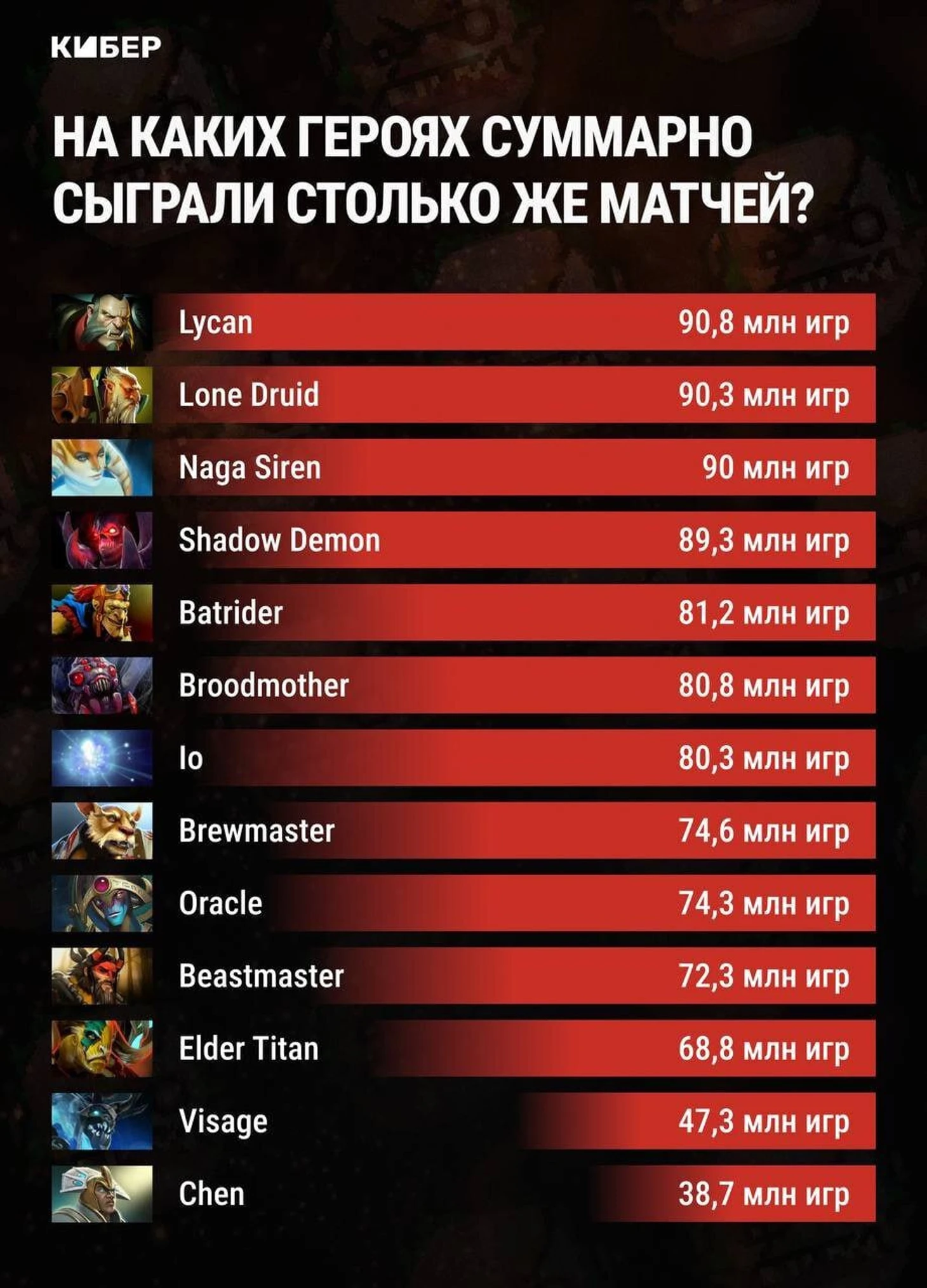 🪝 Миллиард игр – столько суммарно сыграли на Lycan, Lone Druid, Naga Siren, Shadow Demon, Batrider, Broodmother, Io, Brewmaster, Oracle, Beastmaster, Elder Titan, Visage и Chen. Это 13 персонажей, если что.