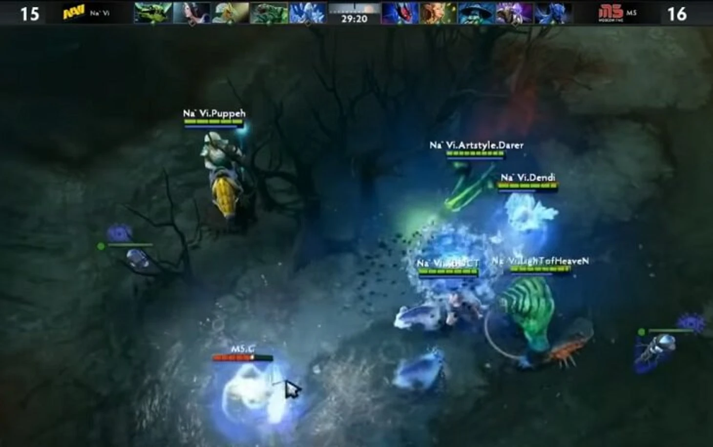 NAVI в Bo1-матче (тогда все матчи плей-офф Инта до топ-4 игрались в формате Bo1) уверенно побеждают M5, а God легендарно заходит в инвизе на вражеский сентри и умирает без байбэка.