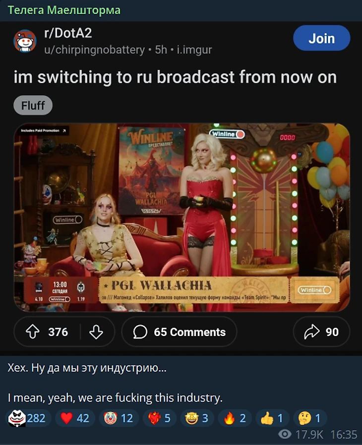Правда вот Maelstorm зацепился за пост на Реддите, где зрители были восхищены декорациями от Paragon. К сожалению, на месте Владимира и незнакомых с контекстом англоязычных зрителей так легко попасть в ловушку. Действительно, переключиться на день-другой с обычной трансляции на шоу весело. Тем более, что человек с Реддита не может оценить что-либо кроме, собственно, картинки. Иронично, что подпись Владимира хоть и является его запатентованной фразой, как нельзя подчеркивает два столпа, на которых сейчас держится трансляция.