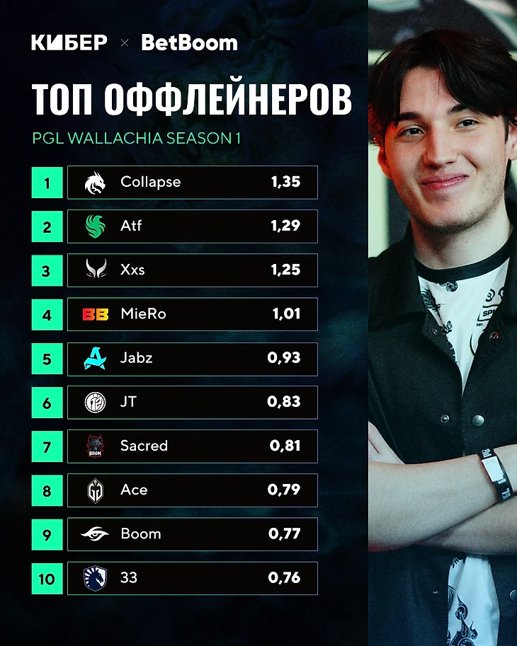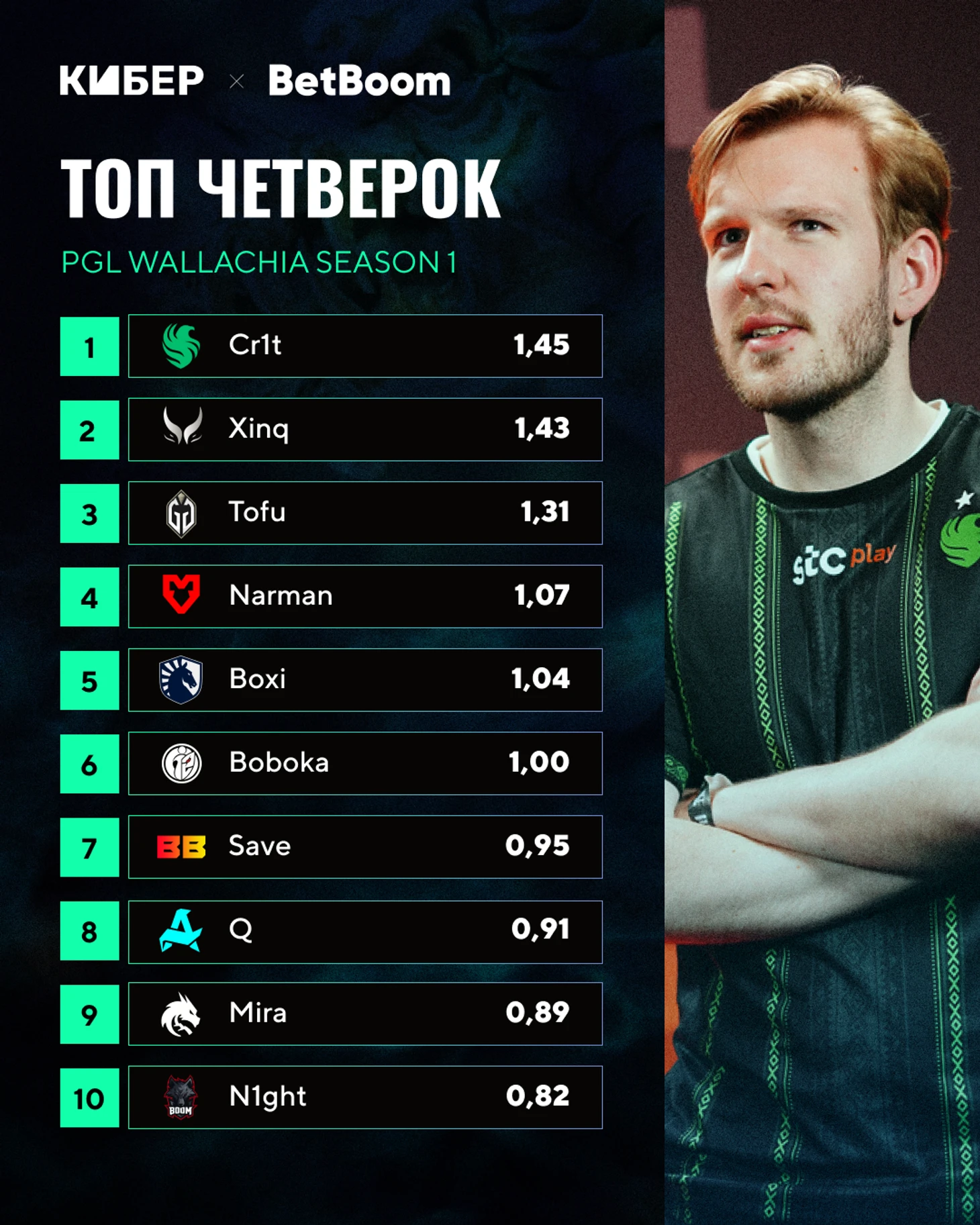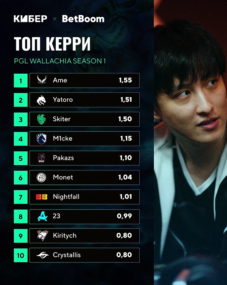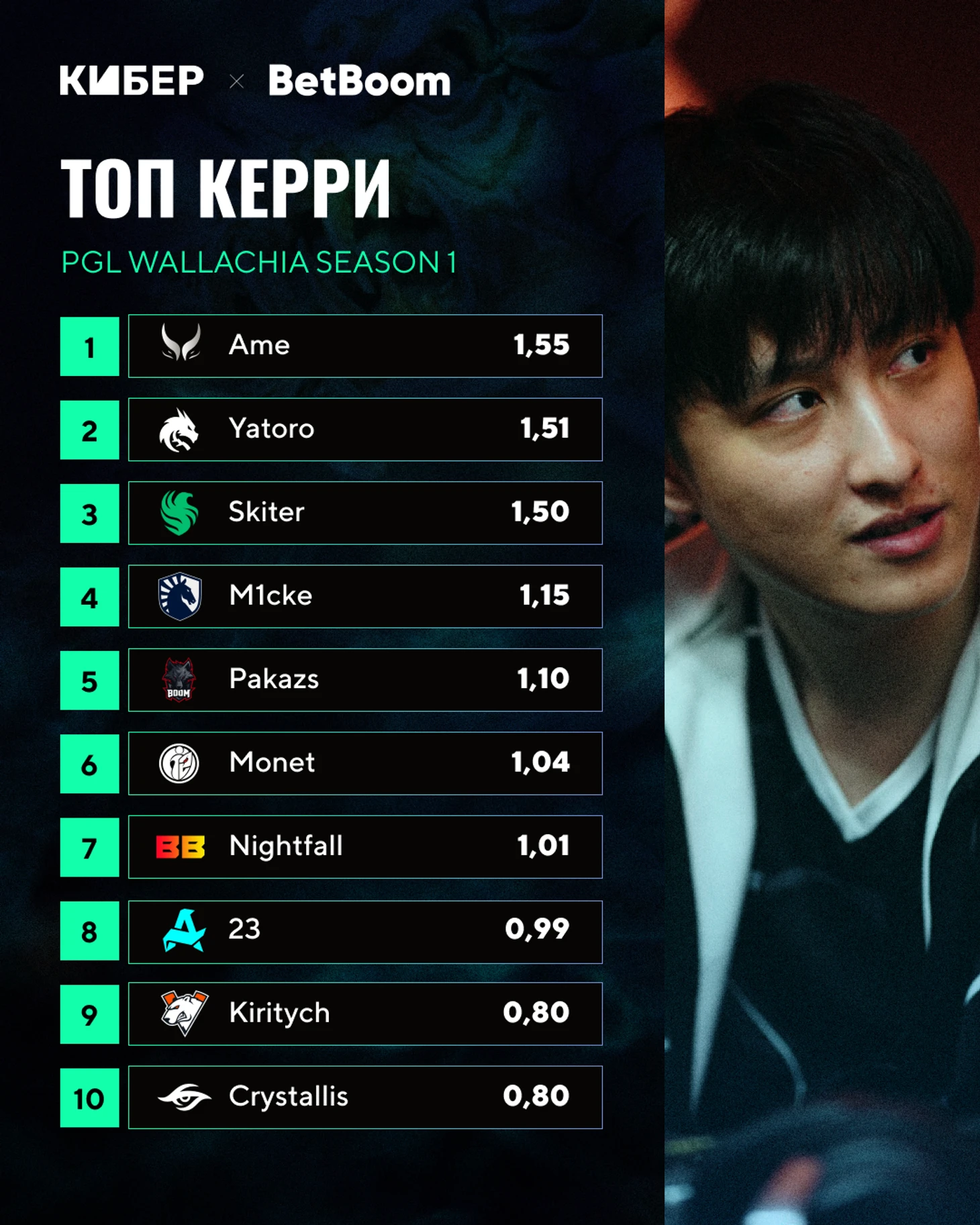 ● BetBoom Team не вышла в плей-офф, но ее игроки все равно в топ-10. Nightfall с рейтингом 1,01 – топ-8, Gpk с 0,95 девятый, Miero с 1,01 – четвертый оффлейнер, но ведущая тройка недостижима – отрыв на 24 сотых.