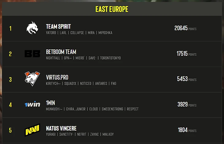ESL возьмет 5 лучших команд по этому рейтингу и уравновесит регионы с помощью коэффициентов. Очевидно, что условные 20 тысяч очков в Восточной Европе – не то же самое, что 20 тысяч очков в Южной или Северной Америке. Таким образом получаем 5 команд. Логично было бы их пригласить, но нет – так определяются лишь дополнительные слоты в региональных квалификациях.