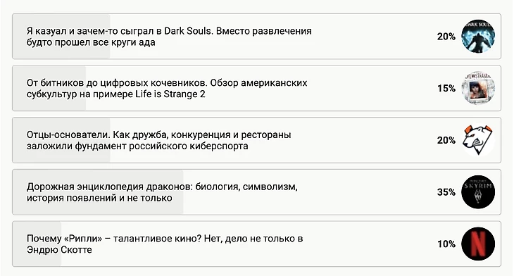 Второе место: «Отцы-основатели. Как дружба, конкуренция и рестораны заложили фундамент российского киберспорта» – 20%, но 43 голоса пользователей. Автор блога «Не журналист» получает 2000 рублей на кошелек Steam.