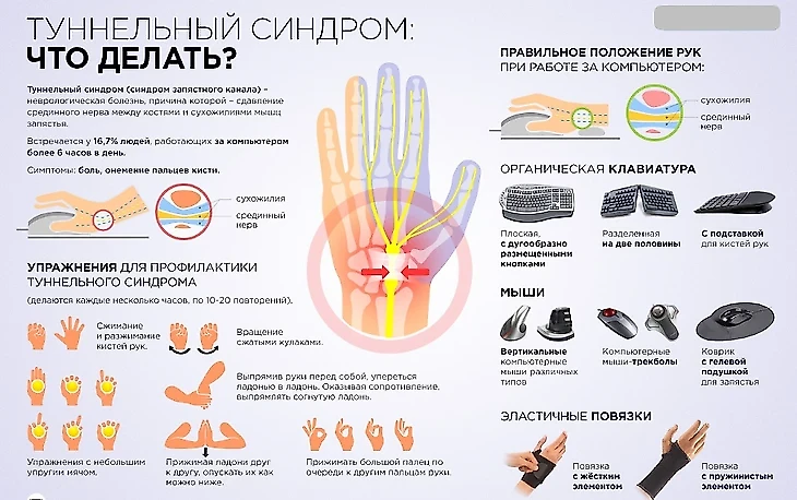 Подробно о туннельном синдроме, его профилактике, симптомах, диагностике и лечении можно почитать по этой ссылке.