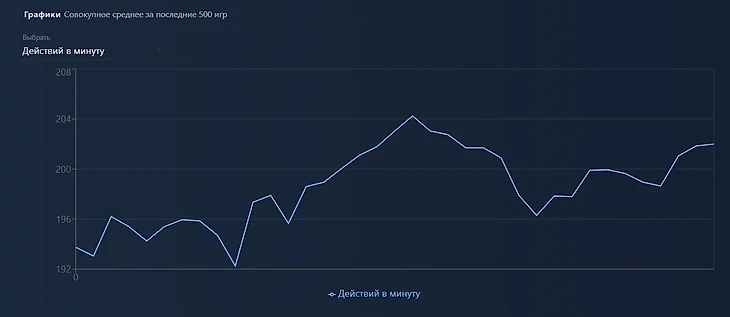 Как и почему я набил столько APM на Спектре, представления нет. Помимо рекордов можно посмотреть и график или гистограмму, чтобы прикинуть средние значения, – «Графики» или «Гистограммы» – «Действий в минуту». Вот мой график: