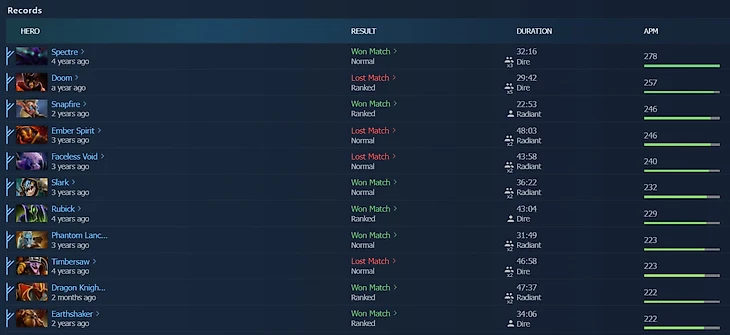 Кстати, свои рекорды по APM можно посмотреть на OpenDota. Открываете свой профиль, жмете «Рекорды» и в списке метрик выбираете «Действия в минуту». Мой топ выглядит так: