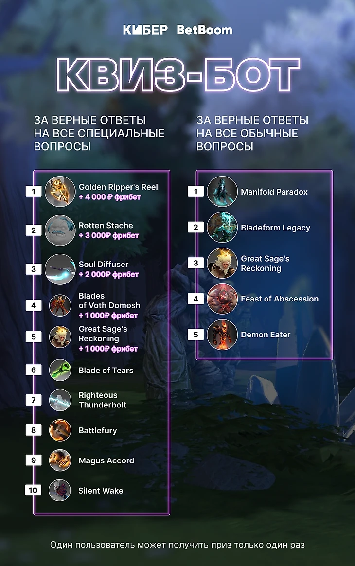 Квиз-бот возвращается на Riyadh Masters! Каждый день отвечай на вопросы про Доту и турнир в Рияде и участвуй в розыгрыше классных призов, которые мы подготовили вместе с нашими друзьями из BetBoom.