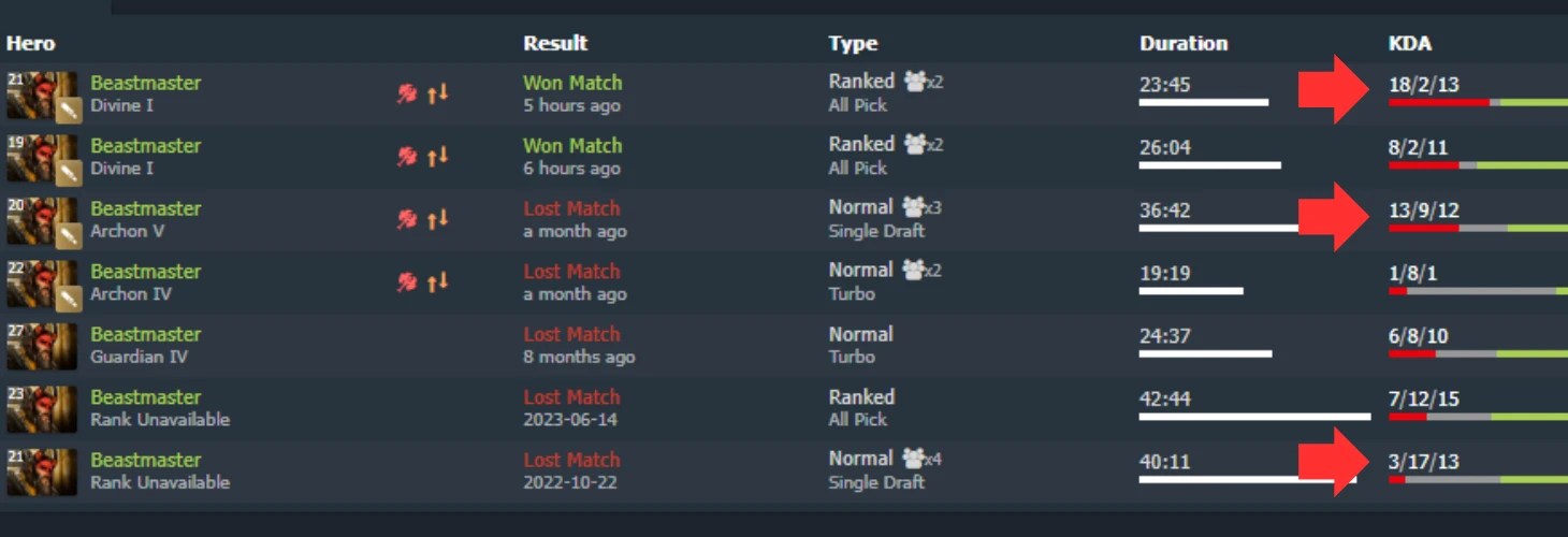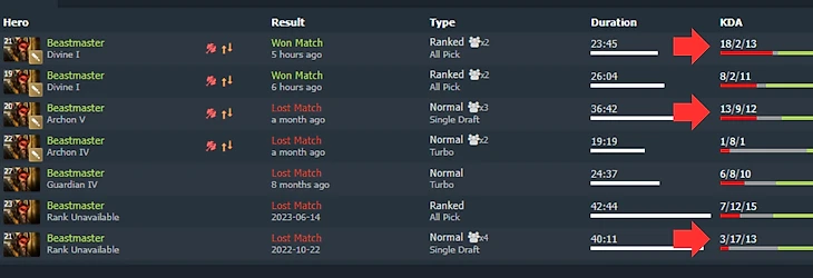 Другой всего за пять игр на Бистмастере (не самом легком герое в Доте) пришел от 12-17 смертей за матч (2022 год) до безумных KDA 18/2/13 или 13/9/12 (период калибровки у Головача).
