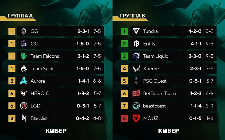 ● Один офигительно веселый расклад, при котором Гладиаторы выходят в верхнюю, Blacklist вылетают, а Spirit, Falcons, OG, Aurora, Heroic и LGD бьются за три места верхней сетки и два – нижней. Одна команда вылетает.