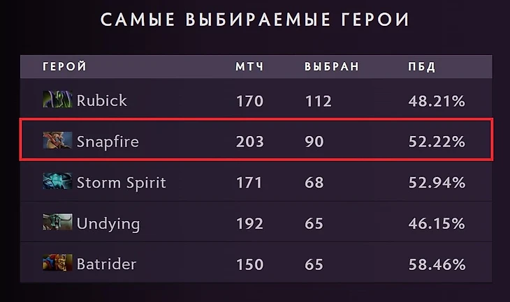 Одно из главных воспоминаний прошлогоднего Riyadh Masters – мидовая Snapfire с критами-Рапирами, которая уничтожала абсолютно все. Тогда она была самым востребованным героем меты, и мы это зафиксировали: