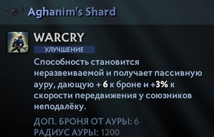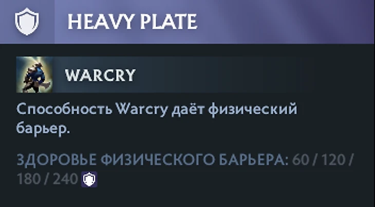 В патче 7.36 ему добавили аспект «Heavy plate», который дает способности Warcry физический барьер всем союзникам в радиусе применения, его здоровье равняется 60/120/180/240. А если купить шард, то скорость тиммейтов увеличивается на 3% и прибавляется +6 к броне. Также способность становится неразвеиваемой.