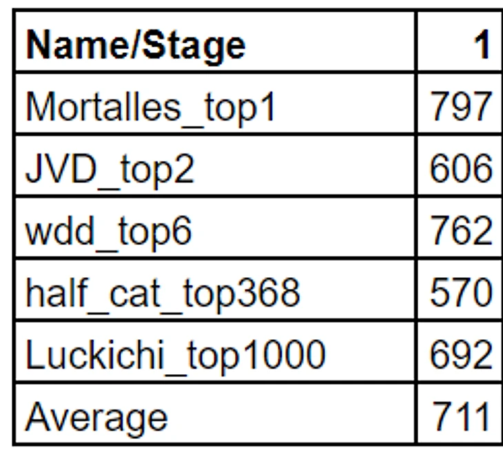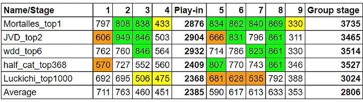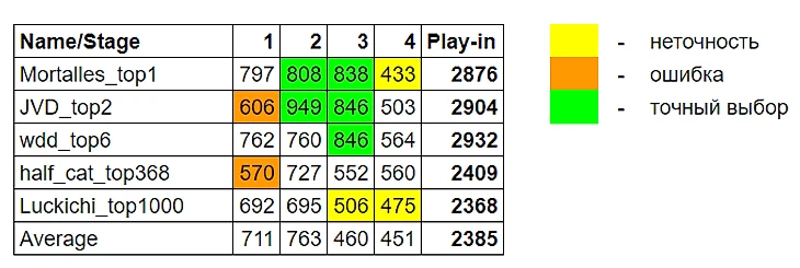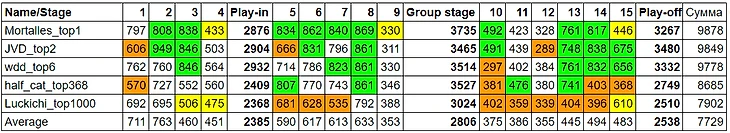 Топ-1 Морт, топ-2 JVD, топ-6 wdd(потому что с Кибера, призов не дали бедному), топ-368 half_cat (я), топ-1000 общей лиги товарищ Luckichi, а также средние значения Average. Значения указаны после округления с Кибера (поэтому итоговые чуть разойдутся с сайтом на пару единиц). Пойдем по порядку.