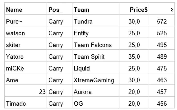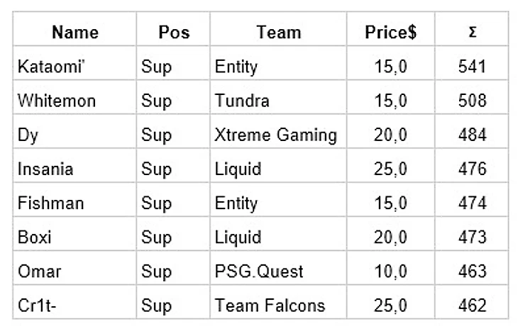 Видно главную проблему простой формулы Кибера. Оффлейнеры не могут догнать остальных. Убйиства/Золото/Стаки и все остальные простые показатели у поз-3 аналогичны поз-1-2, но просто меньше. Видимо, поэтому Кибер ограничил цену оффлейнеров у себя до $25. И то, $25 используется, чтобы исключить выбор всех игроков команды-фаворита (оффлейнер Ликвид за $25, например). Но теперь вы точно запомните, что оффлейнер может быть условно любой. DM за $10 не даст соврать. Много не потеряете при неправильном пике. По остальным ролям в целом ок. Можете на будущее запомнить, что в среднем важнее угадать керри и мид, чем остальные три роли, если формула не изменится.