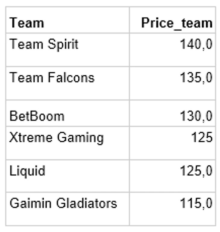 Формально угадали конечно (хотя мне казалось странным топ-3 по стоимости видеть BetBoom Team), но наверно стоит снизить заградительную планку. Общая стоимость в 140 выглядит некорректной.