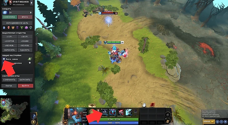 «Бесконечная мана» – одна из самых полезных функций. Одна галочка отключает все перезарядки и затрату маны. Можно мемно спамить спеллы или быстро проверять урон, сверять эффекты и экспериментировать. Но на некоторые способности это не распространяется. Не помогает даже команда «-wtf»: