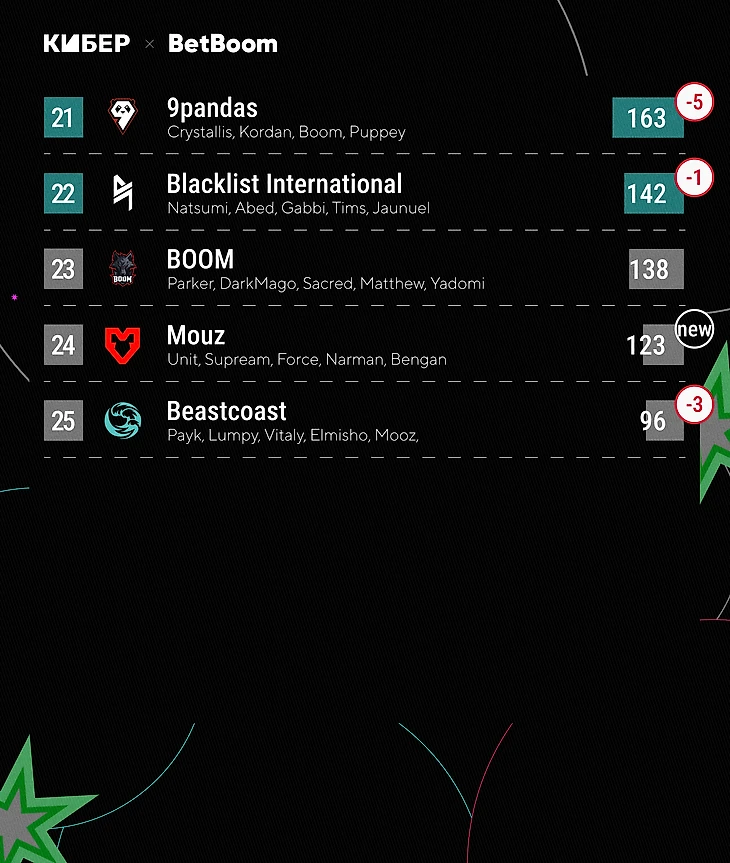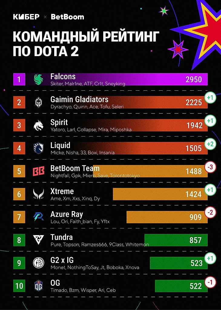 ● BetBoom Team упала на три позиции до пятого места, вверх поднялись Gaimin Gladiators, Liquid и Spirit. 9Pandas и Virtus.pro также просели