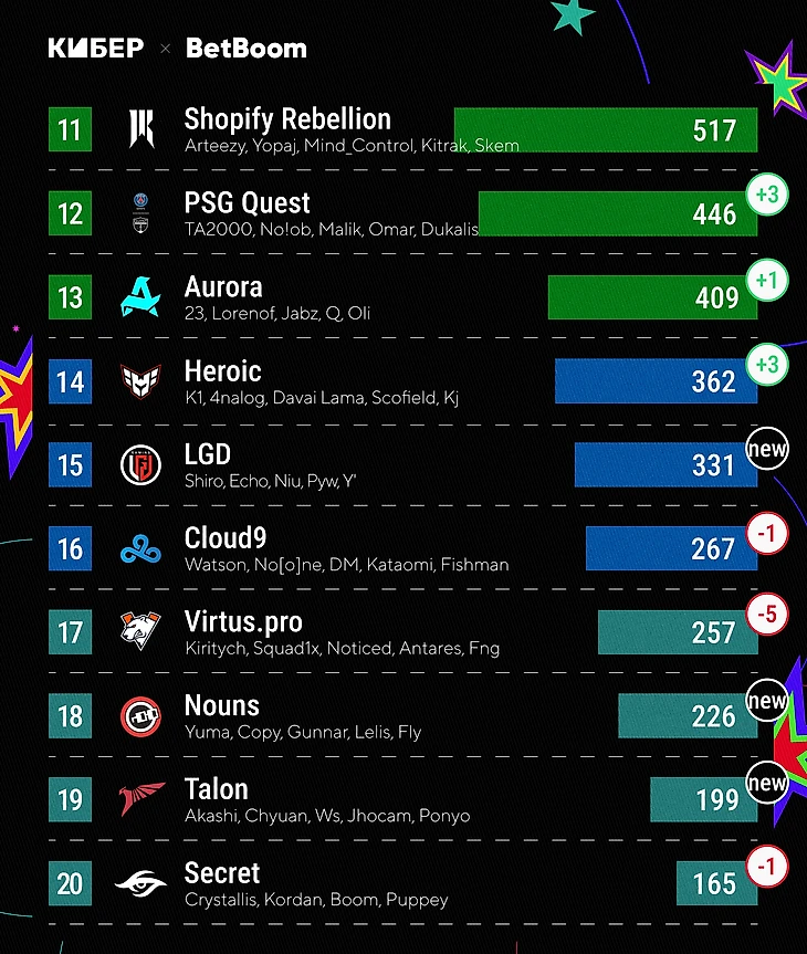 ● В топ-25 4 новых команды. Встречаем LGD на 15 месте, Nouns и Talon на 18-м и 19-м и Mouz на 24-м.