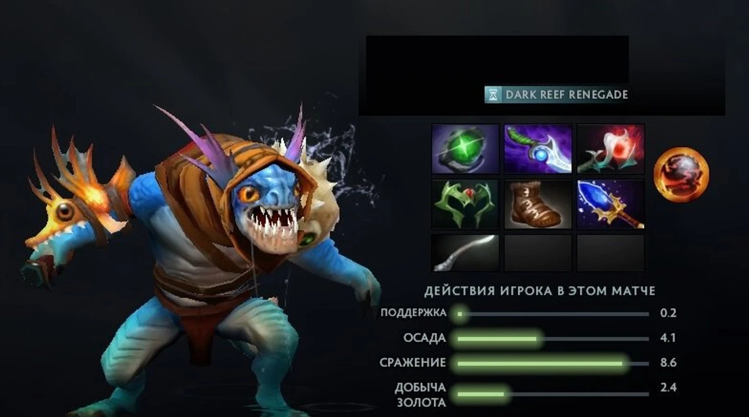 Этот аспект мощно улучшает врожденную способность Сларка – Barracudа. Barracudа – классическая встроенная пассивка, вынесенная в отдельную. Она увеличивает скорость передвижения и восстановления здоровья, если владельца не видит вражеская команда. С Dark Reef Renegade при обнаружении противниками Barracuda отключается с задержкой в 1,5/2/2,5/3 секунды, если в радиусе 900 от владельца нет союзных героев.