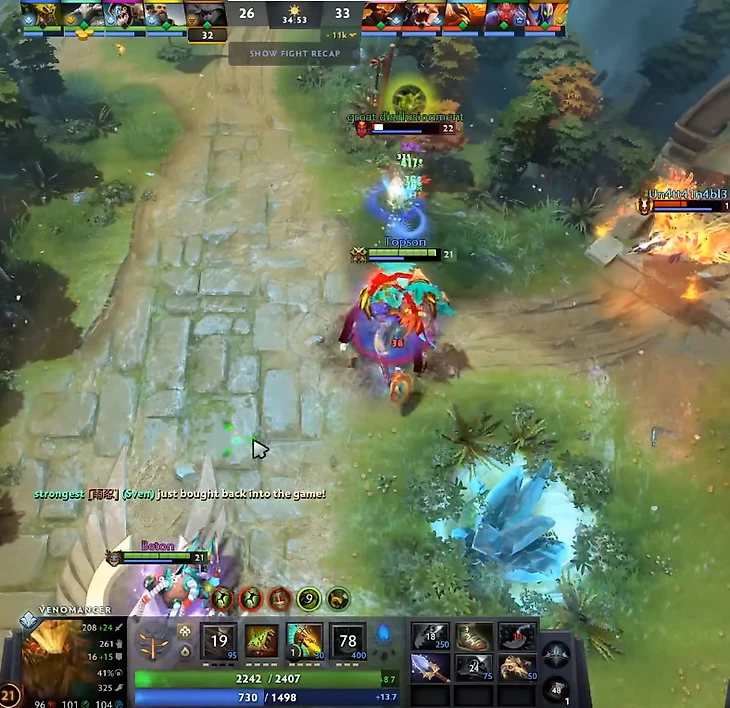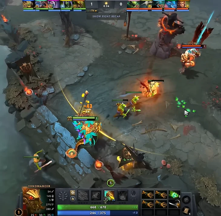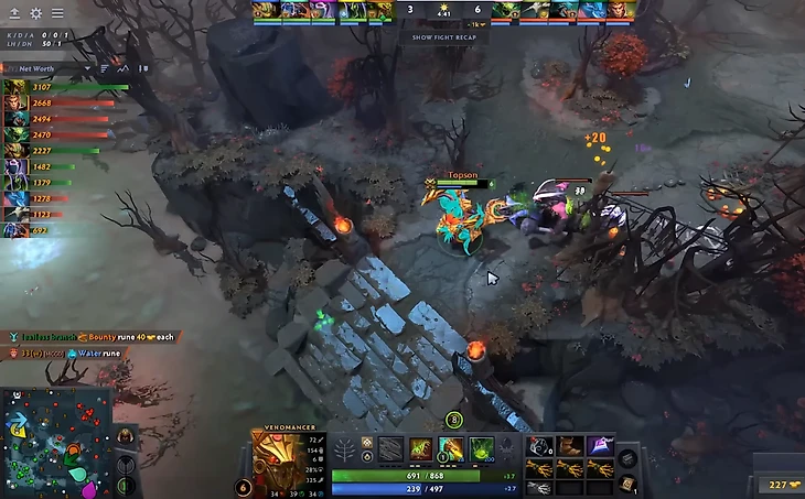Меньше 20 секунд нужно Веномансеру, чтобы закачать большой лагерь нейтралов на 2-м уровне. Затем Топсон возвращается на линию и со змейками 2-го уровня фармит вражеские пачки еще быстрее. Еще до пятой минуты у Веномансера уже почти 7-й уровень и 3100 нетворса – сумасшедшие тайминги!